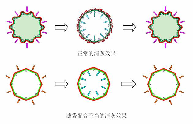 我們知道,脈沖清灰實際上是利用脈沖氣流與二次氣流對濾袋的沖擊,使濾袋由上向下在緯向出現形變,形變的慣性和濾袋與籠骨的碰撞在表面粉塵層造成“雪崩效應”,從而清除表面灰塵。清灰效果很大程度上取決于形變慣性的大小和濾袋與籠骨碰撞的強度。實際應用中,由于濾袋緯向尺寸過小或使用中濾料熱收縮程度太大等原因,經過一段時間使用,濾袋“捆綁”在籠骨上無法分離。此時,脈沖清灰造成的濾袋形變很小,濾袋與籠骨碰撞烈度有限,表面粉塵無法有效清除。 粉塵在濾袋表面長期積累與板結就可能造成糊袋。